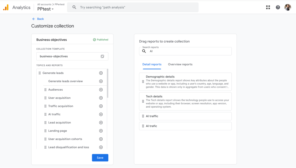 6. กลับมาที่หน้า Library → เลือก Business objectives→เลือกจุดสามจุด แล้วกดคำว่า “Edit”→ ค้นหาชื่อ Report ที่กด Save ไว้ → ลากไปที่ช่อง Topics and Reports → คลิก Save