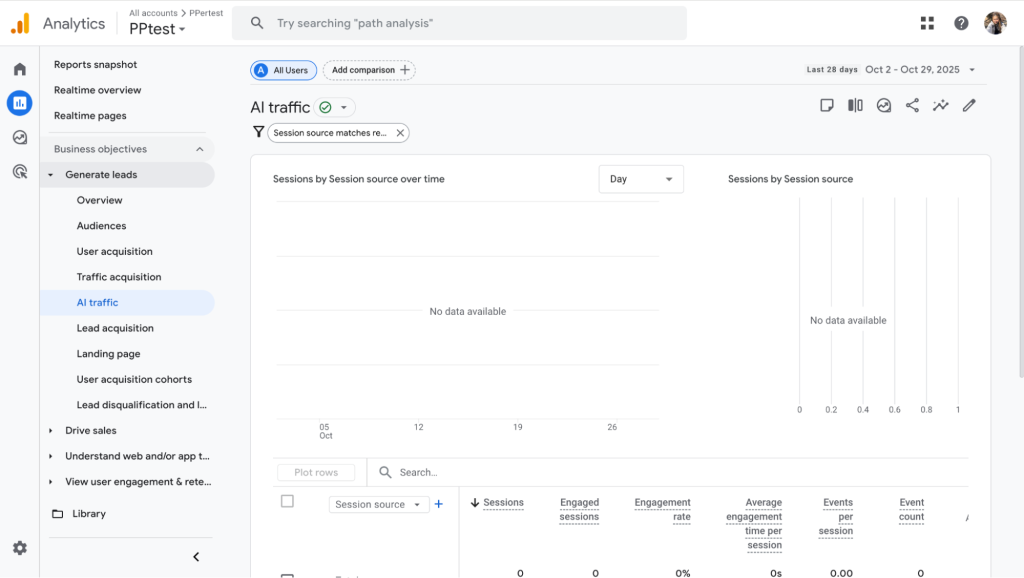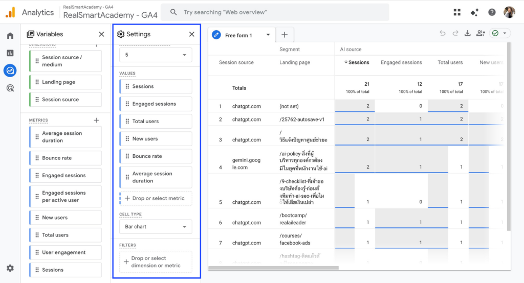 ดูจาก Session Source / Referrer ของผู้เข้าเว็บ โดยกรอง Session Source ให้ตรงกับชื่อ Domain ของ AI เหล่านั้นดังนี้