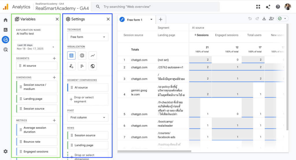 - ให้ทีมการตลาดหรือ Data Analyst ตรวจสอบ “AI Traffic” ผ่าน GA4