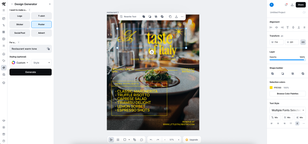 เมื่อเทียบกับ Canva ที่หลายคนใช้ประจำ Canva เหมาะกับคอนเทนต์รายวัน ทำโพสต์ไวๆ ได้สะดวก โดยการเลือก template มาใช้ ส่วน Kittl จะโดดเด่นตรงที่ช่วยให้งานที่เกี่ยวกับ “การสร้างภาพลักษณ์ธุรกิจ” ออกมาดูจริงจังและมืออาชีพมากกว่า ด้วยฟีเจอร์อย่าง Design Generator ที่สร้างชิ้นงานตามหัวข้อ ตามการตั้งค่าเลือกสีและสไตล์ของเรา เช่น AI Logo Generator หรือ Poster Generator จะได้ผลลัพธ์เป็นไฟล์ขึ้นมา ได้ Typography รูปเฉพาะตัวที่ทำให้งานแต่ละชิ้นมีเอกลักษณ์แถมยังสามารถแก้ไขคำได้ไม่กระทบกับสไตล์ที่ AI สร้างขึ้นมาให้