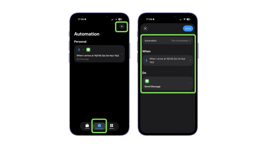 ตัวอย่างง่าย ๆ จากสิ่งที่ผู้เขียนลองทำเองแบบเร็ว ๆ ผู้เขียนลองตั้ง Shortcuts ให้ทำงานอัตโนมัติไว้แบบนี้ค่ะ ถ้าวันไหนเดินทางถึงที่ทำงานแล้ว ให้ส่งข้อความไปบอกแฟนว่า “ถึงที่ทำงานแล้วจ้า” ทางไลน์