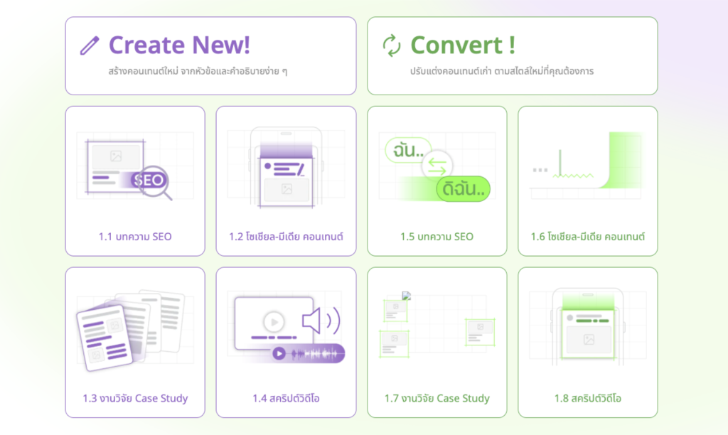 - มีเทมเพลตกว่า 80 แบบ ครอบคลุมบทความ แคปชั่น และสคริปต์วิดีโอ ให้เหมาะกับทุกงานการตลาด
