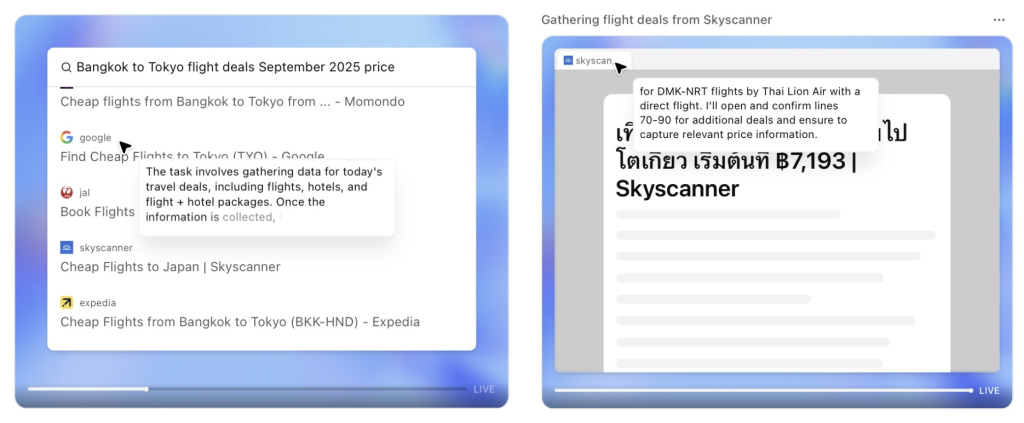 - เช่น ได้โจทย์ให้ “จองตั๋วเครื่องบินที่ถูกที่สุด” > AI Agent จะรู้ว่าต้องค้นตั๋วเครื่องบินจากหลายเว็บไซต์ > เปรียบเทียบราคา > สรุปเป็นตาราง Excel ให้เลือก พร้อมคำแนะนำว่าอันไหนถูกสุด แถมยังถามว่าให้จองให้ไหม?
