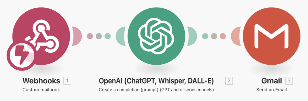 - เช่น ระบบทำงานอัตโนมัติเมื่อได้รับอีเมล > ส่งต่อให้ AI ประมวลผลคำตอบ > ตอบกลับอีเมลอัตโนมัติ