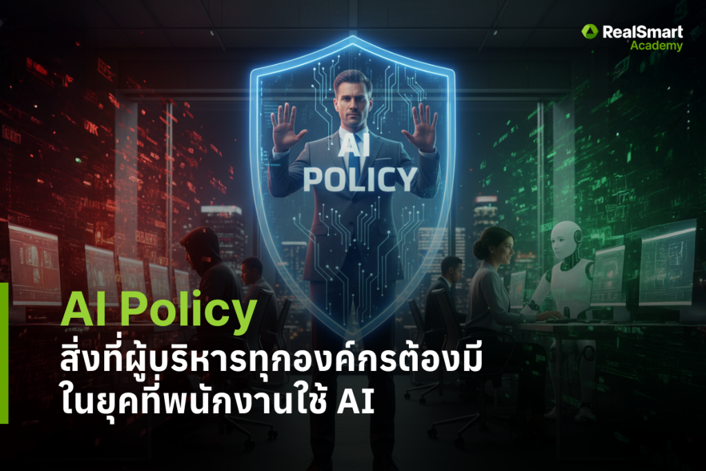 หากคุณอยากเรียนรู้เชิงลึก เห็นตัวอย่างจริง และได้แนวทางปฏิบัติที่สามารถนำไปใช้ร่าง AI Policy ให้เหมาะสมกับองค์กรของคุณ ติดตามได้ในหลักสูตร Real AI Leader ของ RealSmart Academy นะครับ